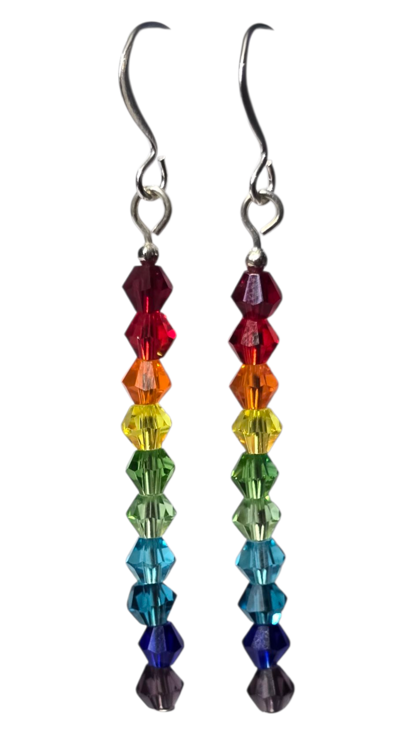 Add a burst of color and sparkle to your day with these crystal rainbow drop earrings. Designed in a sleek stick style, each earring features a cascading row of vibrant crystal beads that catch the light beautifully.