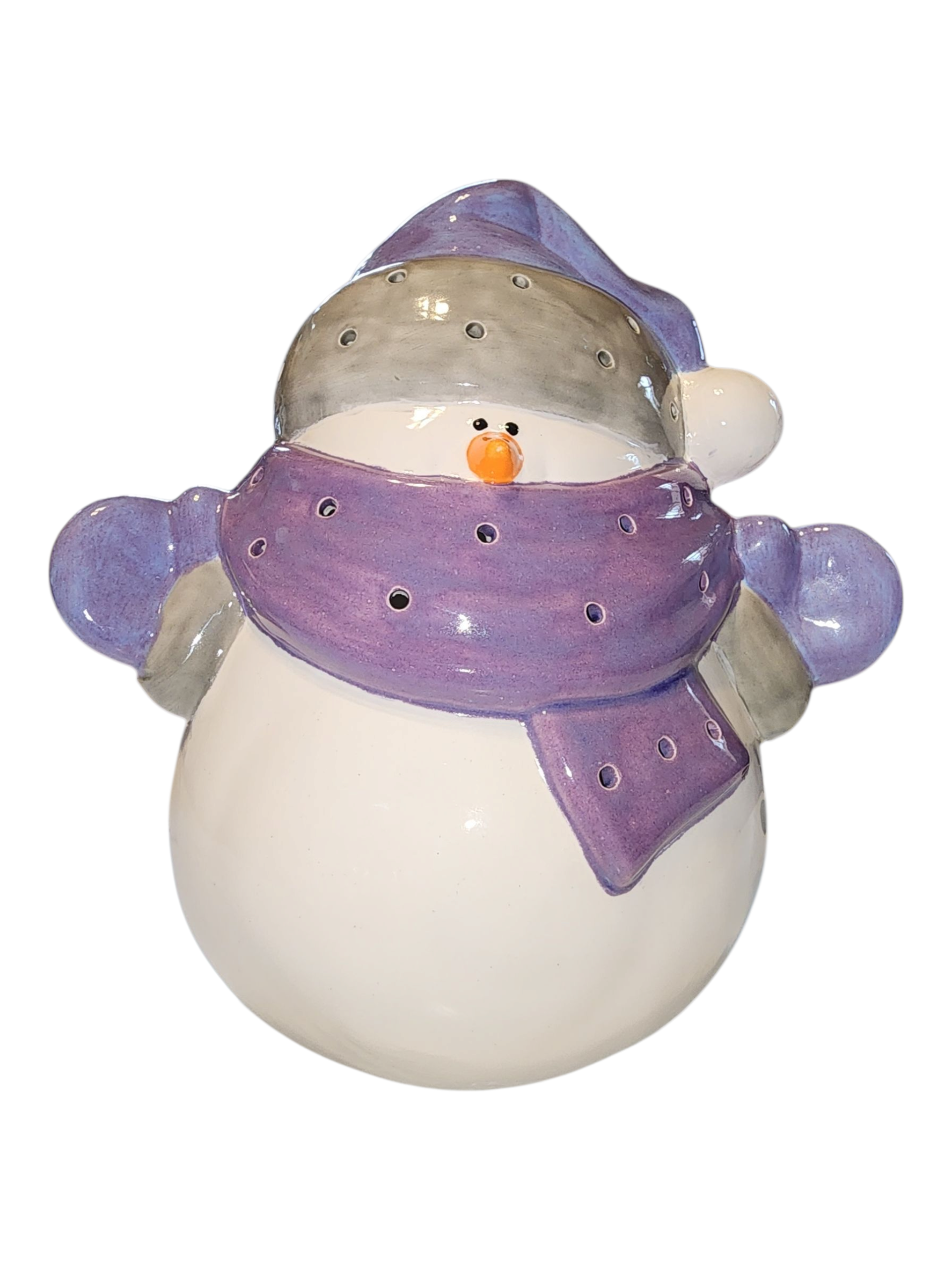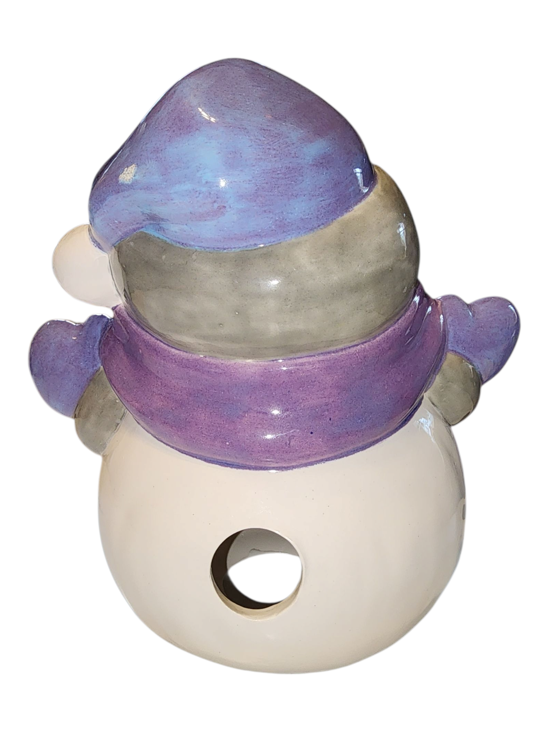 Bring a touch of winter whimsy to your décor with this delightful handcrafted ceramic snowman. Standing 8 inches tall, this piece is glazed in a beautiful blend of Lavender Flower, Big Sky Blue, White, and Sooty Grey, creating a cozy and playful sparkle that brightens any space.