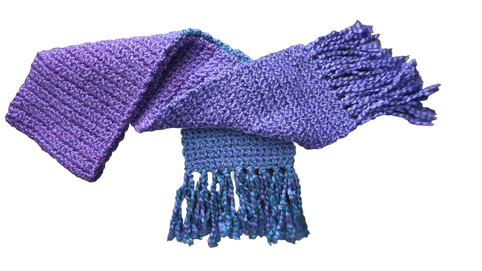Indulge in the luxurious warmth and style of our Crocheted Scarf. Made with a stunning purple and blue blend and crafted from Lion's Brand Homespun Petunia Stripes, this scarf is a must-have for any fashion-forward individual. Whether you're braving the cold or simply adding a touch of elegance to your outfit, our scarf offers both practicality and sophistication with its 46-inch length and 6-inch width. Elevate your wardrobe with this exclusive accessory.