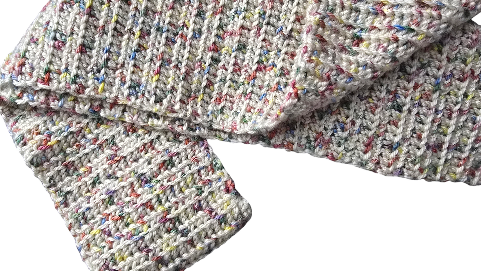 Crocheted Scarf: Tan with Rainbow Flecks - Caron Simply Soft, Speckle: Vintage