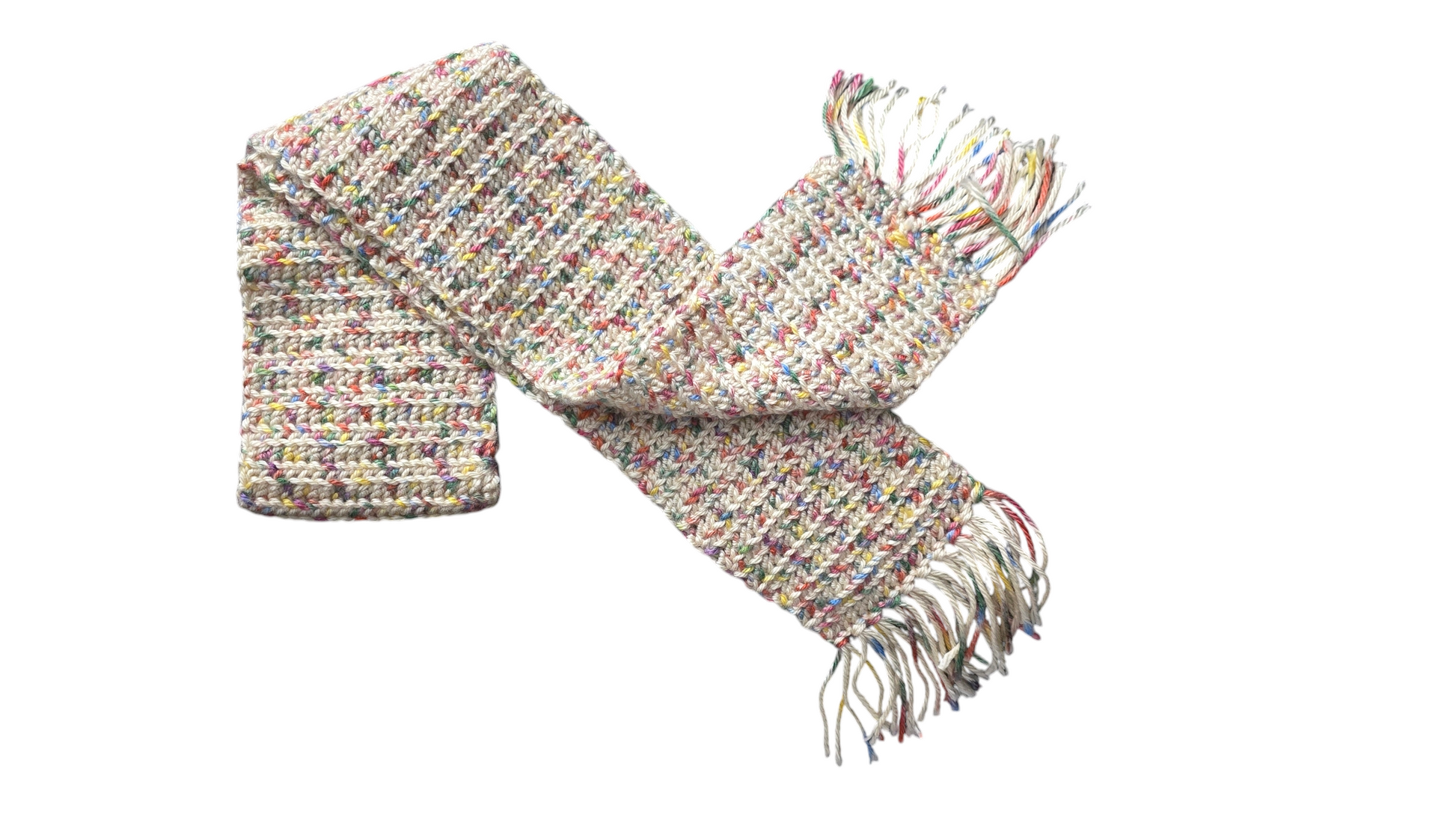 Add a pop of color to your winter wardrobe with our handmade crocheted scarf. The tan base is accented with playful rainbow flecks, making it both stylish and unique. Made from Caron Simply Soft yarn, it's soft and cozy to keep you warm. The scarf is 42 inches long by 4 inches wide.