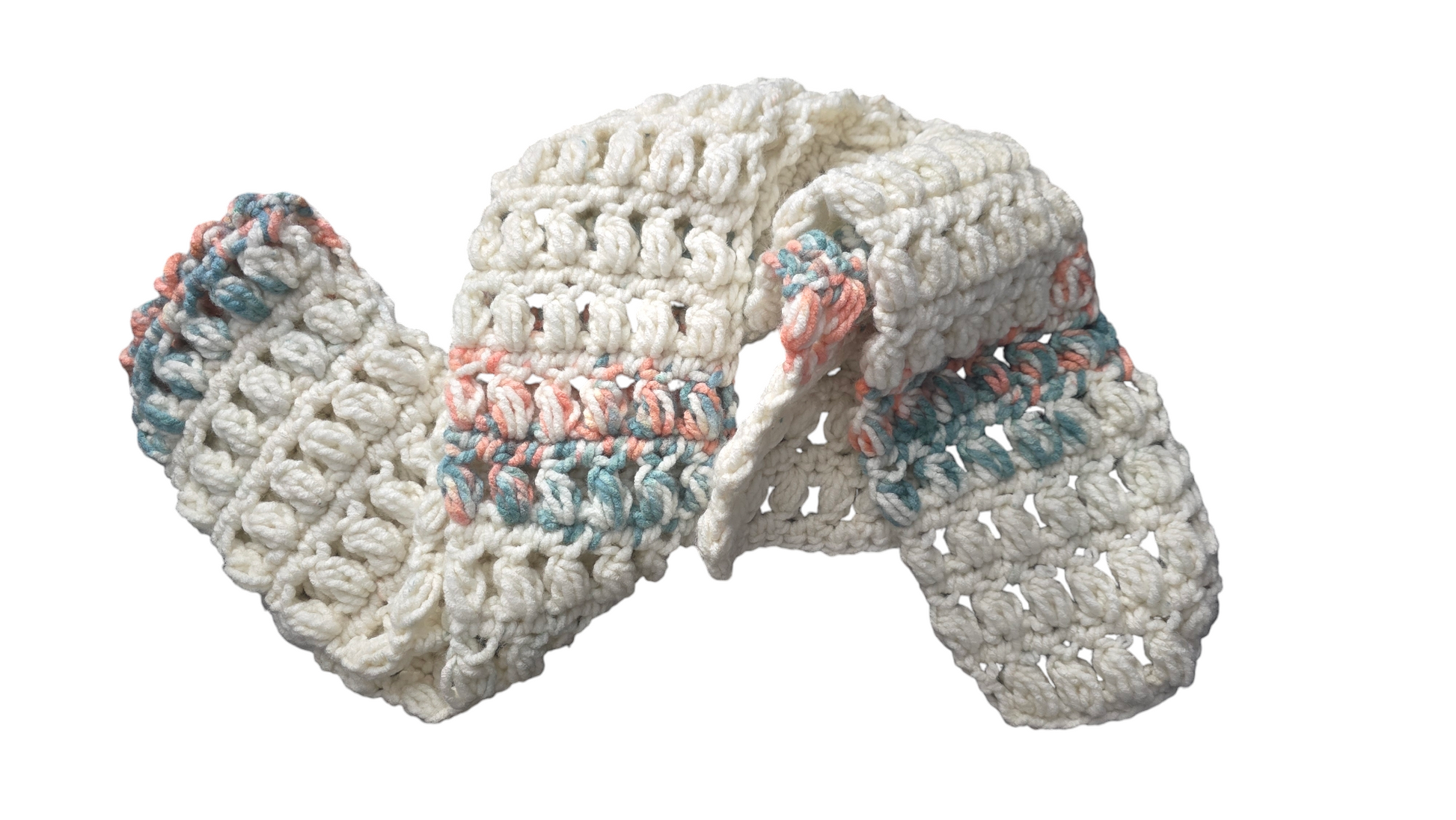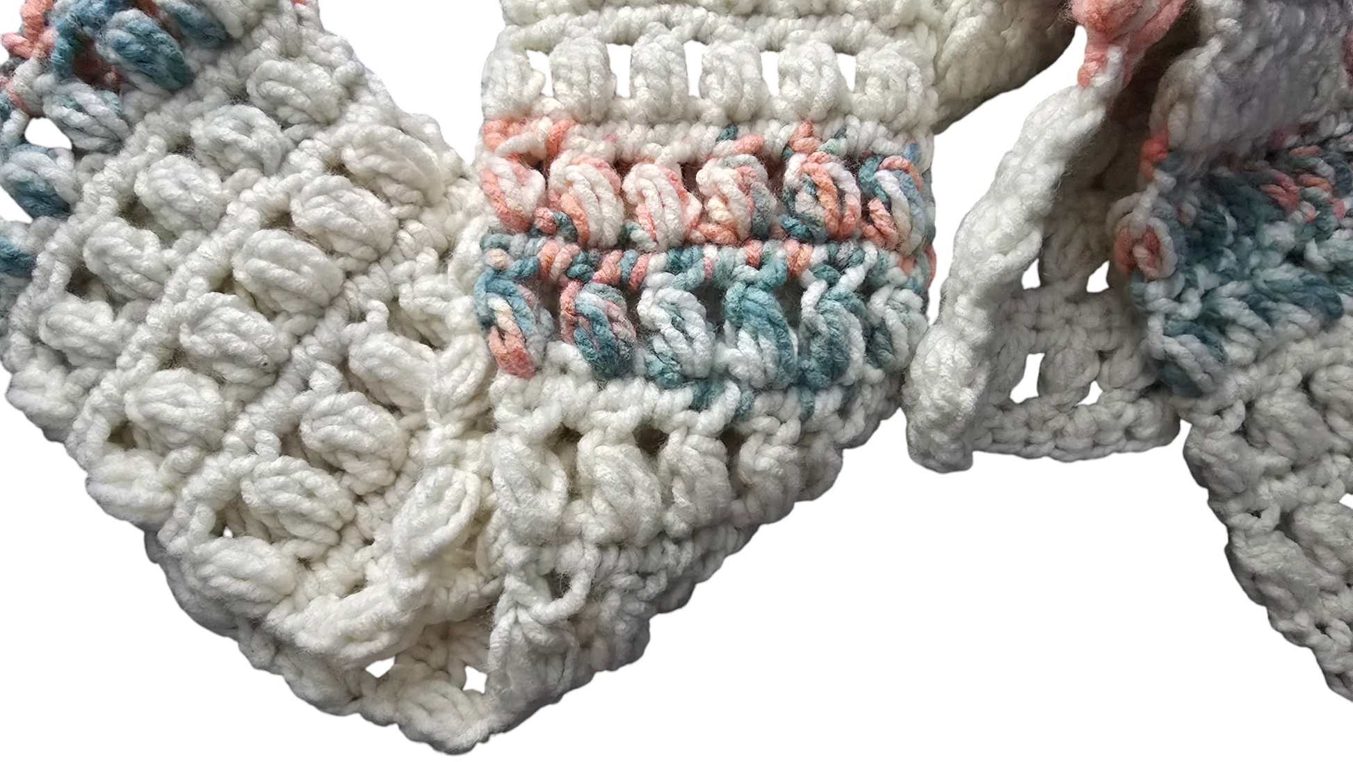 Crocheted Scarf: White w/Green & Pink - Premier, Bloom Chunky: Gerbera