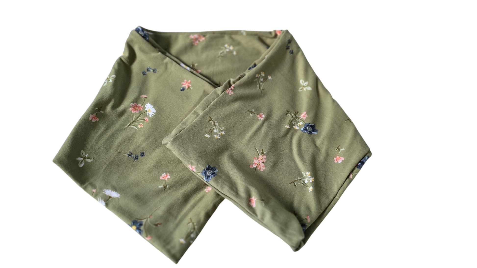 Wrap yourself in cozy chic with our Infinity Scarf in earth tones. This double-sided scarf features navy florals on tan jersey and tiny flowers on olive green brushed jersey knit. Perfect for adding a pop of print to any outfit.